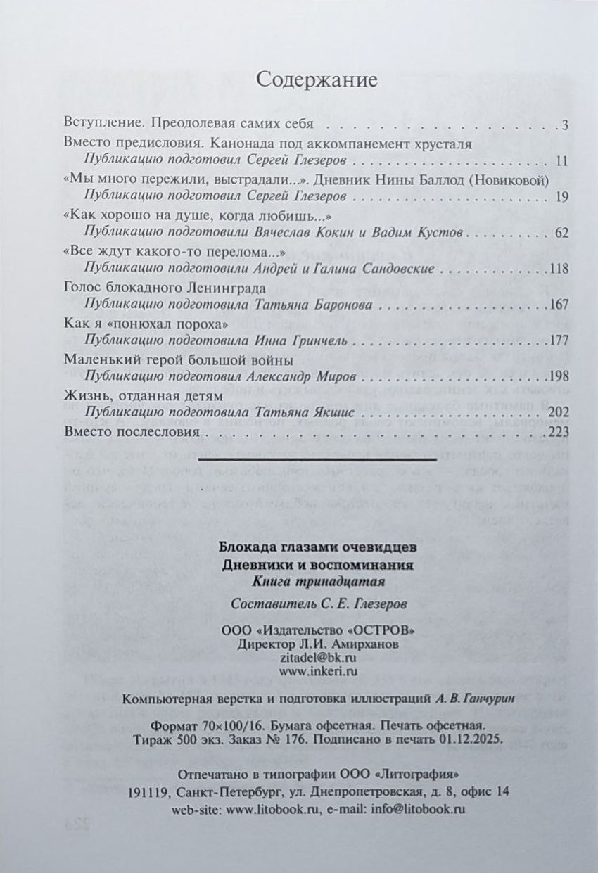 В тринадцатую книгу серии "Блокада глазами очевидцев" вошли дневники и письма непосредственных свидетелей блокадных дней, а также воспоминания о жизни в осажденном Ленинграде и об эвакуации из него, тяжелой жизни вдали от любимого города и о судьбах людей, оказавшихся между линиями фронта.