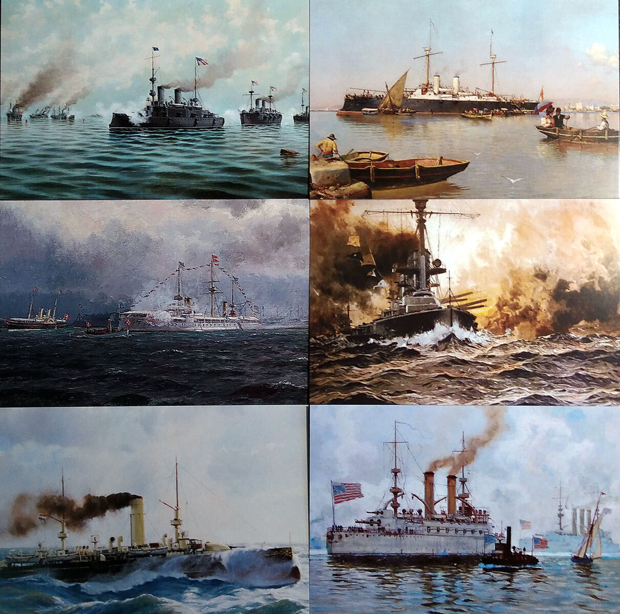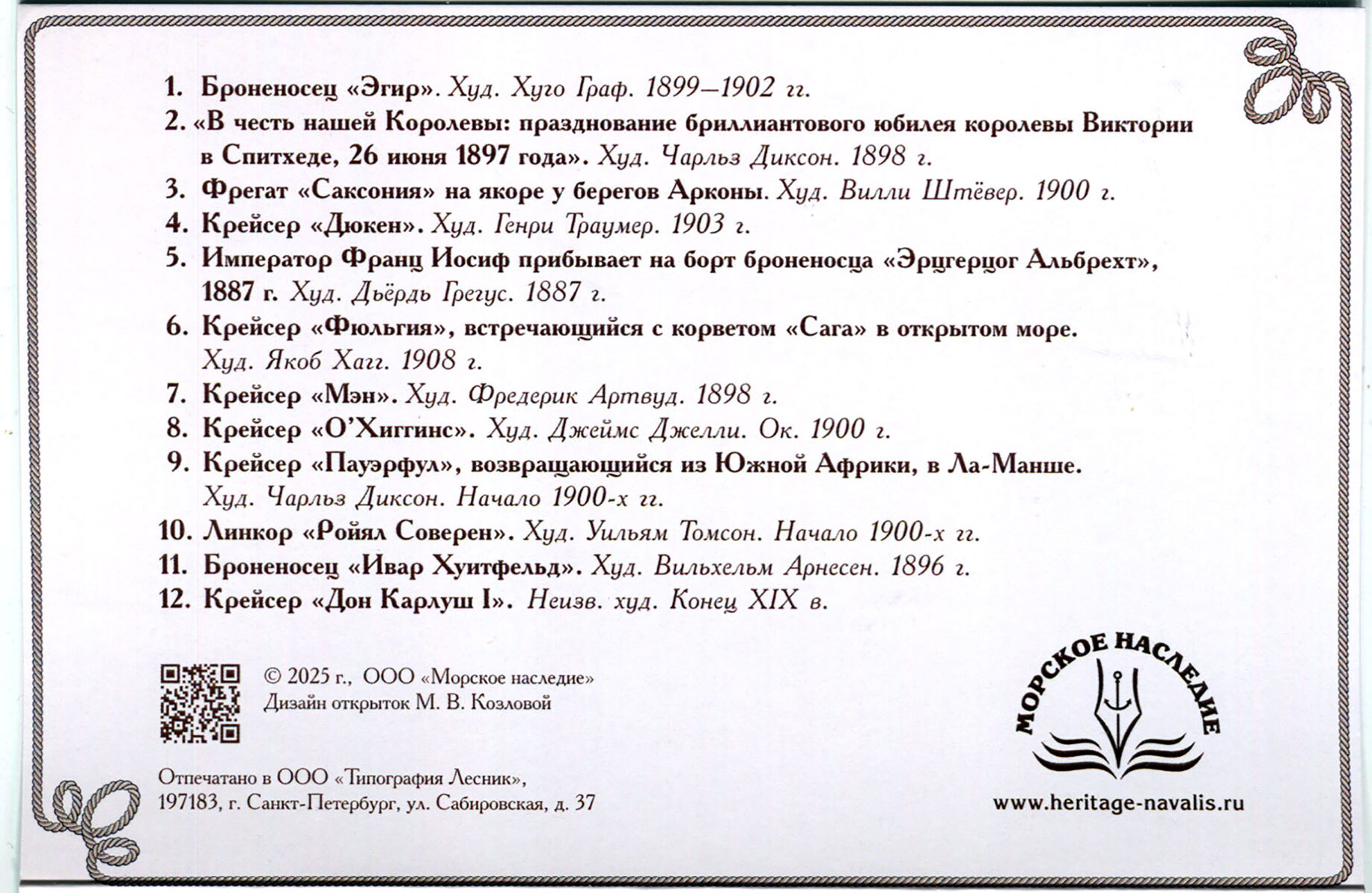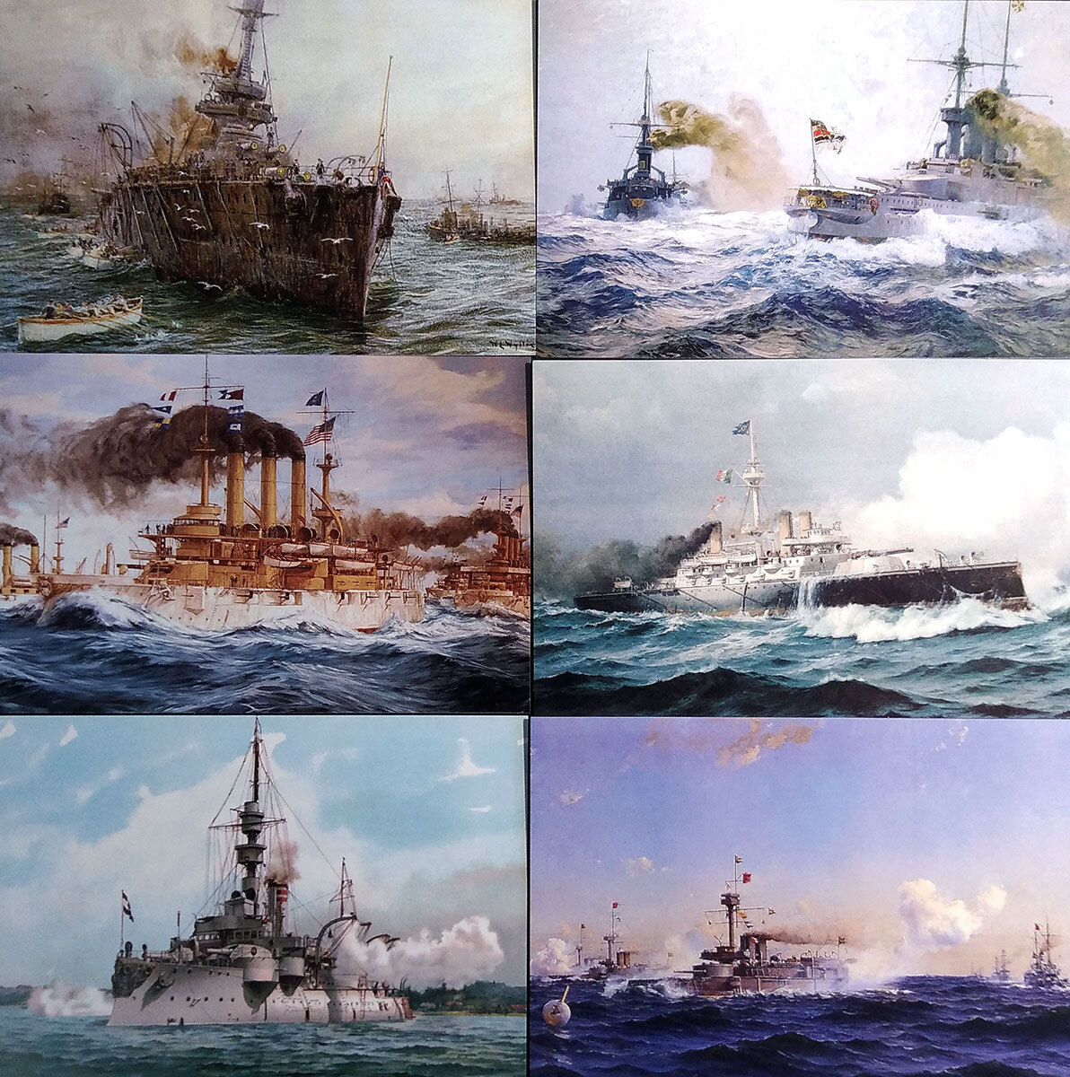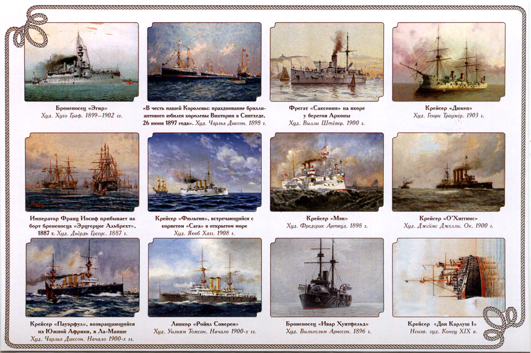 В наборе из двенадцати открыток представлены репродукции картин с изображением кораблей основных классов иностранных флотов, построенных в конце XIX - начале XX века.