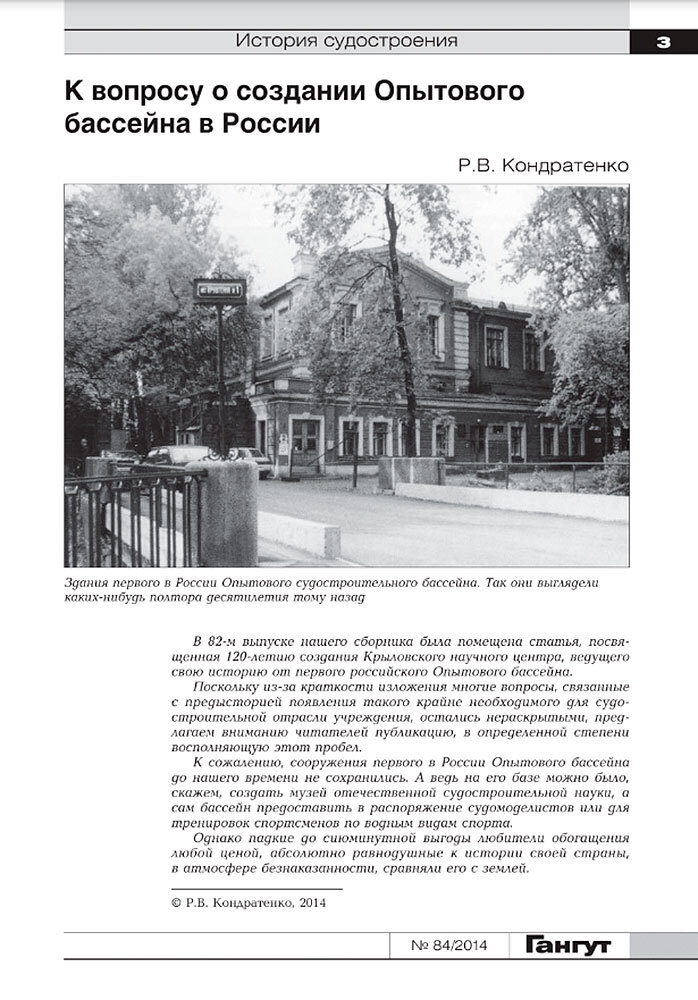 Р. В. Кондратенко. К вопросу о создании Опытового бассейна в России.