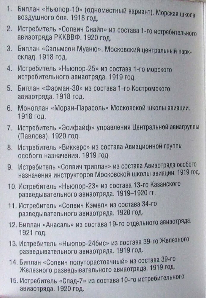 На открытках данного набора представлены различные типы самолетов, на которых воевали красные лётчики во время Гражданской войны: разведчики «Анасаль», «Сальмсон Муаню», «Сопвич», «Фарман-30», истребители «Виккерс», «Сопвич Кэмел», «Сопвич Снайп», «Сопвич триплан», «Ньюпор-10», «Ньюпор-23», «Ньюпор-24бис», «Ньюпор-25», «Спад-7» и «Эсифайв». Показаны различные окраски самолетов, личные эмблемы и надписи, отрядные отличия, тактические обозначения и опознавательные знаки. Цветные рисунки самолетов, выполненные художником А.В. Казаковым, сопровождаются их реальными фотографиями.