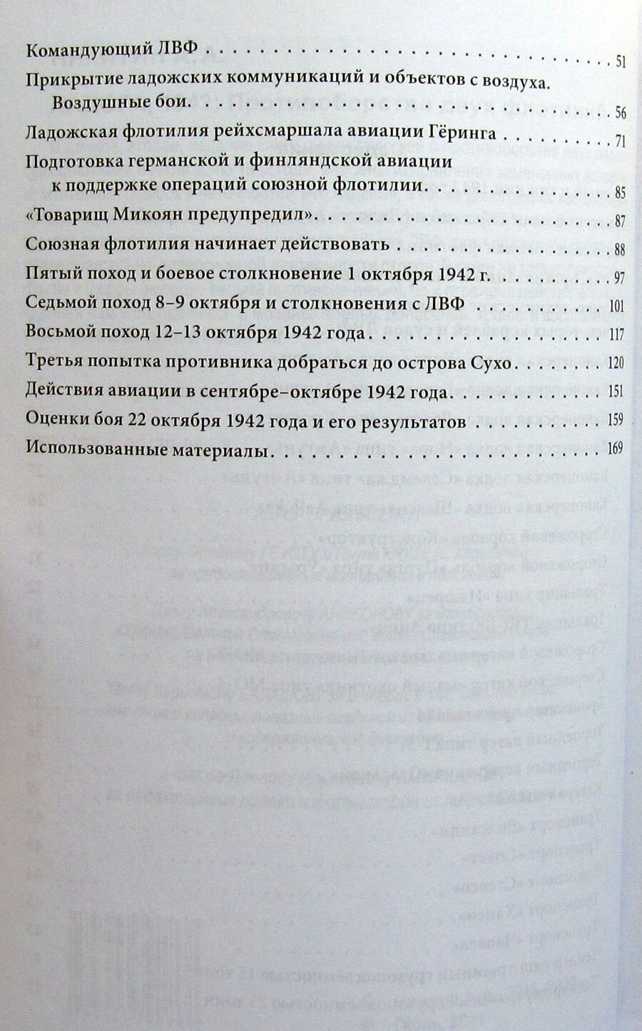 Андрей Абрамович Никитин приводит в своей книге данные о двух флотилиях, действовавших на Ладоге в 1942 году, рассказывает о формировании ладожской флотилии трех стран гитлеровского блока и о её действиях в противоборстве с нашей Ладожской флотилией (ЛФВ) во главе с В. С. Чероковым. На основе документов и публикаций рассматриваются боестолкновения вражеской флотилии с ЛФВ и попытки противника нарушить сообщение по нашим ладожским трассам, увенчавшиеся не слишком удачным, но получившим широкий резонанс набегом на остров Сухо 22 октября 1942 года. В книге приводятся сведения о составе флотилий и ТТХ судов и кораблей, переброске противником на Ладогу плавсредств из Италии, Бельгии и Германии, излагаются оценки хода и результатов боя за остров Сухо, сделанные каждой из сторон.