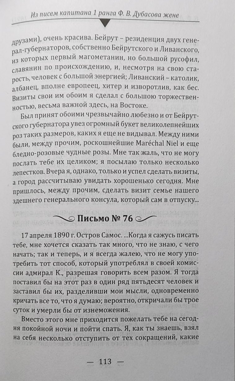 Ф. В. Дубасов - один из ярких представителей русского военно-морского корпуса второй половины XIX века. Участник Русско-турецкой войны, награждённый орденом Святого Георгия за потопление монитора «Сейфи», он прошёл долгий путь службы, завершив его вице-адмиралом и генерал-губернатором Москвы в годы тяжёлых потрясений начала ХХ века. Однако в данных письмах перед нами предстает не государственный деятель, а внимательный наблюдатель, требовательный командир и любящий муж.