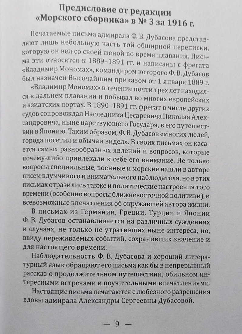 Восьмая книга из серии «Библиотека альманаха "Боевые корабли мира"», посвящённая фрегату «Владимир Мономах» и его дальнему плаванию 1889-1891 годов. Издание основано на письмах капитана 1 ранга Фёдора Васильевича Дубасова, адресованных супруге и передающих живой и непосредственный взгляд офицера на службу, море и людей, окружающих его в ежедневных заботах корабельной жизни.