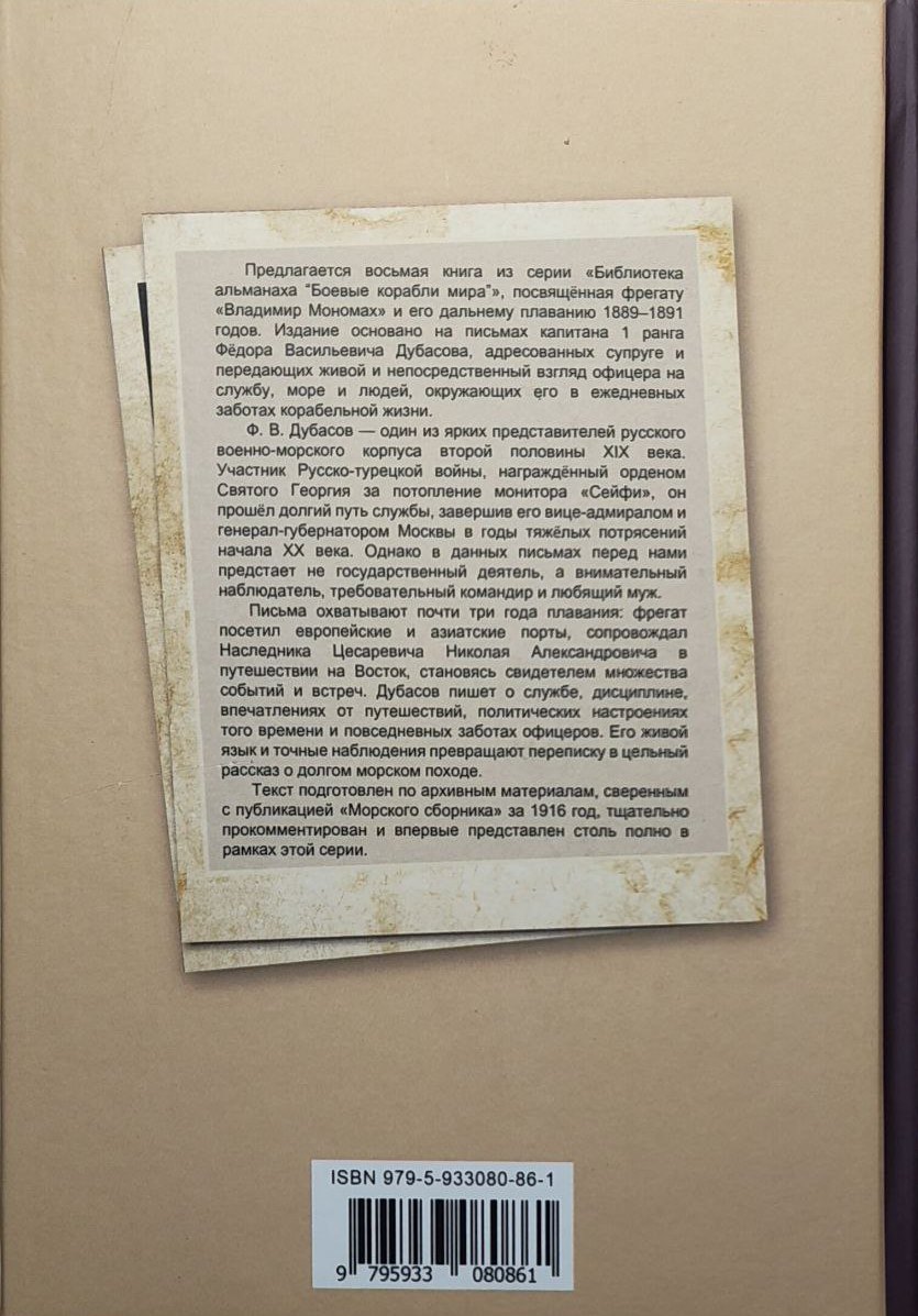 Восьмая книга из серии «Библиотека альманаха "Боевые корабли мира"», посвящённая фрегату «Владимир Мономах» и его дальнему плаванию 1889-1891 годов. Издание основано на письмах капитана 1 ранга Фёдора Васильевича Дубасова, адресованных супруге и передающих живой и непосредственный взгляд офицера на службу, море и людей, окружающих его в ежедневных заботах корабельной жизни.