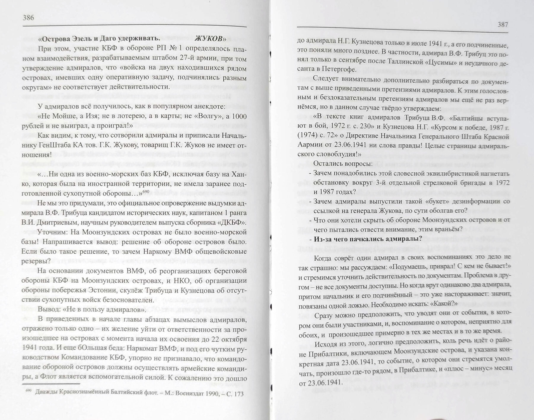 Книга о боевых действиях Береговой обороны КБФ в Прибалтике в 1941 году воссоздаёт атмосферу напряжённости, отваги и мужества советских людей, показывает истоки патриотизма защитников в годы испытаний. В то же время автор в живой форме рассказывает о создании и укреплении различных мифов об обороне Прибалтики, о роли командующего КБФ адмирала В. Ф. Трибуца, минами запершего флот в Финском заливе, и его послевоенного «творчества», благодаря которому боевые действия 3-й (на Моонзундских острова) и 8-й (на Ханко) стрелковых бригад оказались приписаны командованию КБФ и его Береговой обороне. Автор, являясь потомком защитника Моонзундских островов в 1941, посчитал необходимым на основании использованного материала, не претендуя на полноту изложения, высказать свою оценку имитации боевой деятельности в Прибалтике командующим КБФ вице-адмиралом В. Ф. Трибуцем, подрывающей боеспособность сухопутных войск.