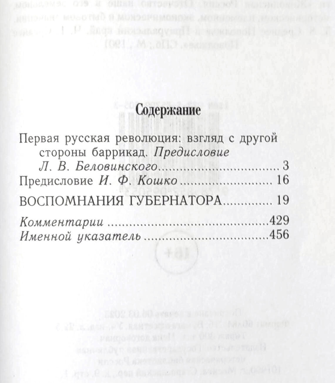 Иван Францевич Кошко (1859–1927) – российский государственный деятель, служил в Министерстве внутренних дел, брат криминалиста А. Ф. Кошко. Вице-губернатор Самары, позже губернатор Пензы, затем Перми. «Воспоминания губернатора» охватывают 1905–1909 годы, в том числе время Первой русской революции. Крестьянские бунты, митинги, террористические акты описаны здесь с точки зрения представителя власти, призванного усмирять «распропагандированные массы». При этом И. Ф. Кошко, работая в начале карьеры в земстве, пытался улучшить жизнь земледельцев: организовывал кустарную промышленность и доступные для крестьян кредиты, в период его губернаторства развивалась инфраструктура и росли экономические показатели. Однако, как пишет автор воспоминаний, «террор распространялся на всех, независимо от личных качеств». Мемуарист подвергался реальной опасности, о чем пишет довольно увлекательно, в книге также множество описаний преступлений и способов побега из тюрем. И. Ф. Кошко уделяет внимание и нравам провинциальных дворян, их образу жизни, приемам гостей и балам. Он был близко знаком с правительственными чиновниками А. Д. Арбузовым, П. Н. Дурново, П. А. Столыпиным – их характеры нашли отражение в воспоминаниях.