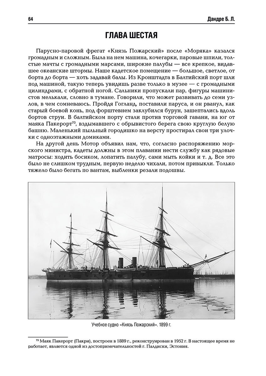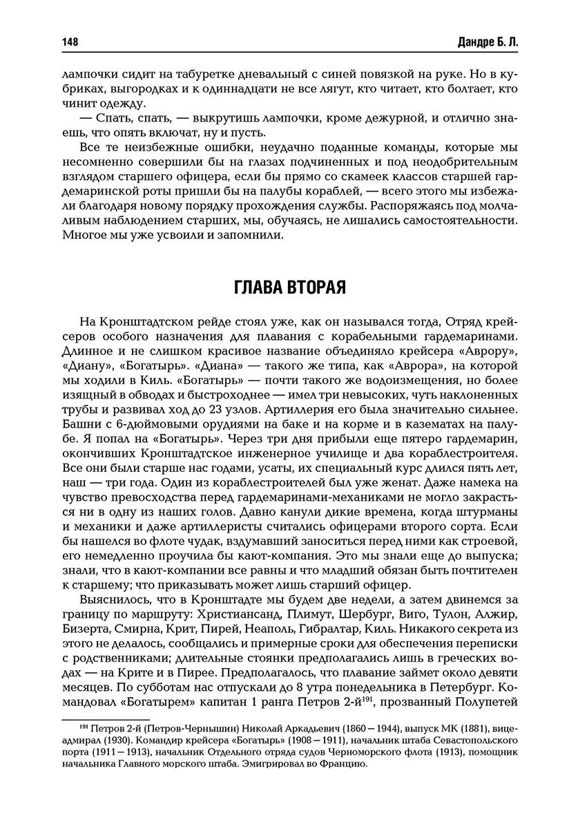 Воспоминания и рассказы Б. Л. Дандре, выпускника Морского корпуса 1909 года, хронологически охватывают годы его учебы в старейшем высшем учебном заведении России и последующую службу на кораблях Балтийского флота, в том числе в период Первой мировой войны. Автор талантливо описал многогранную картину жизни Морского корпуса и флота предреволюционных лет. Основное внимание в воспоминаниях уделено такой малоизученной странице флотской жизни, как морской быт. Дополнительную ценность представляют многочисленные характеристики, описания деловых и личностных качеств руководителей Морского ведомства и штаба Балтийского флота, воспитателей и преподавателей Морского корпуса, офицеров плавсостава. Рассказы освещают некоторые исторически значимые события Первой мировой войны, непосредственным участником которых являлся сам автор. К ним следует отнести подавление готовящегося бунта на линейном корабле «Император Павел I» в 1912 году, гибель крейсера «Паллада» в 1914 году, минные постановки в горле Финского залива в навигацию 1915 года и многие другие.